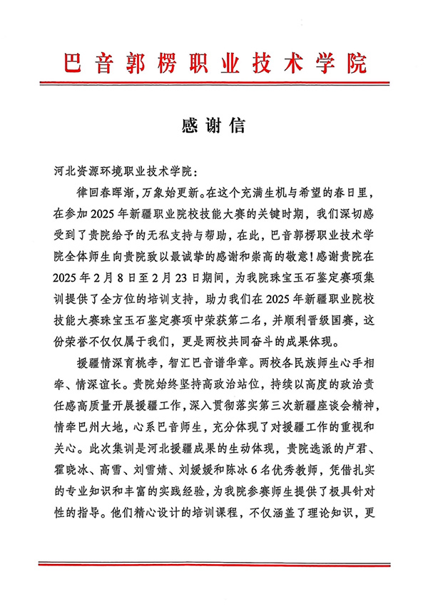 来信提到,在河北资源环境职业技术学院的无私支持和帮助下,巴音郭楞职业技术学院在2025年新疆职业院校技能大赛珠宝玉石鉴定赛项中荣获第二名并顺利晋级国赛。