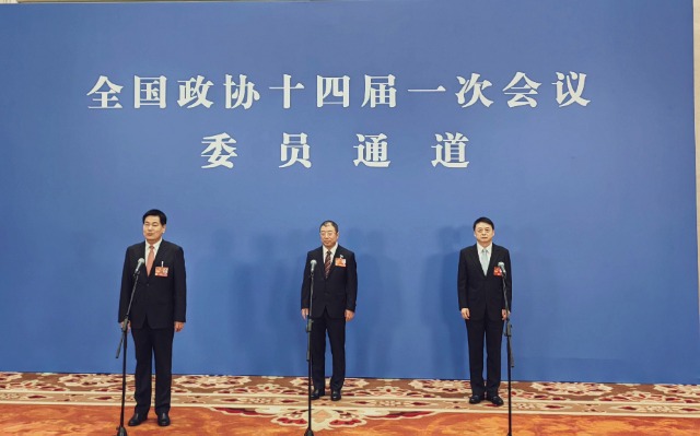 3月7日上午,全国政协十四届一次会议第二场“委员通道”集体采访活动在人民大会堂新闻发布厅举行,全国政协委员、民建中央常委、中华职业教育社副理事长苏华(左1)接受采访。